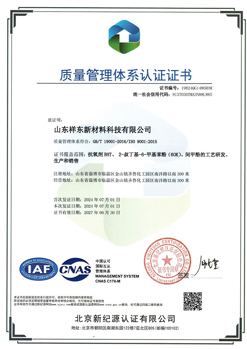 山東祥東新材料科技有限公司1.2萬(wàn)噸/年6-叔丁基鄰甲(60K)、4-叔丁基鄰甲酚(偏 24 酚)和 4,6-二叔丁基鄰甲酚(偏 246 酚)烷基甲酚項(xiàng)目竣工環(huán)境保護(hù)驗(yàn)收監(jiān)測(cè)報(bào)告