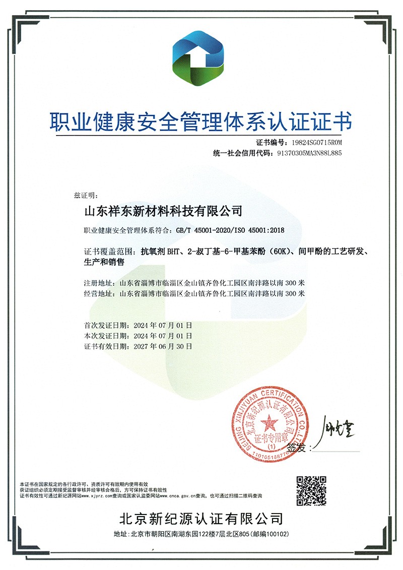 山東祥東新材料科技有限公司1.2萬噸/年6-叔丁基鄰甲(60K)、4-叔丁基鄰甲酚(偏 24 酚)和 4,6-二叔丁基鄰甲酚(偏 246 酚)烷基甲酚項(xiàng)目竣工環(huán)境保護(hù)驗(yàn)收監(jiān)測報(bào)告